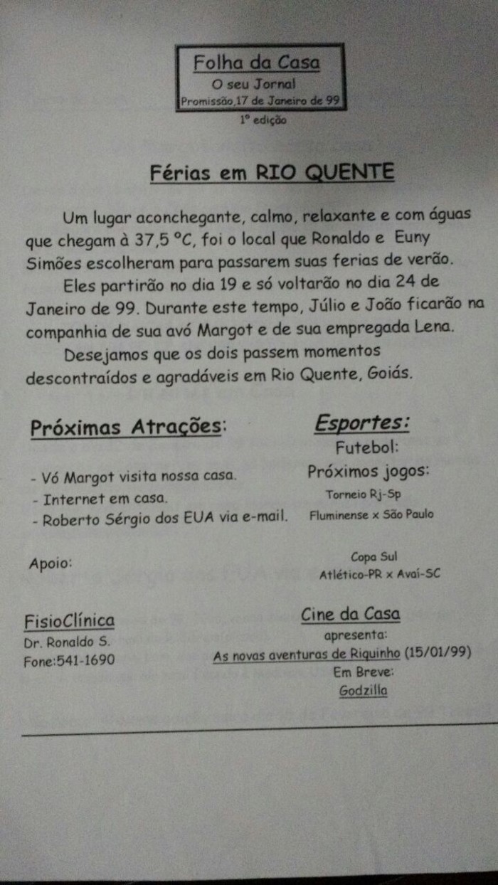 Eu recortava todas essas propagandinhas e colava as que mais gostava em uma parte das folhas de papel almaço que meu pai usava para dar aula. A folha era grande e dupla, o que dava um caderninho de quatro páginas. Na primeira, eu desenhava uma espécie de logotipo que ficava no topo e se lia “Folha da Casa”. Ali também ia uma manchete, sempre algo relevante que estava acontecendo na família — uma visita da avó, por exemplo. Também havia outras pequenas chamadas para algum assunto quente que eu copiava do jornal do pai. E os cartazinhos da programação de cinema, claro.